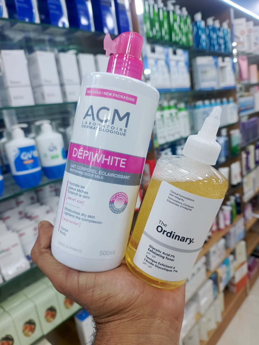 - لوشن ACM ديبي وايت (500 مل): لوشن فرنسي طبي، غني بمواد فعالة لترطيب البشرة وتفتيح التصبغات وتوحيد اللون.