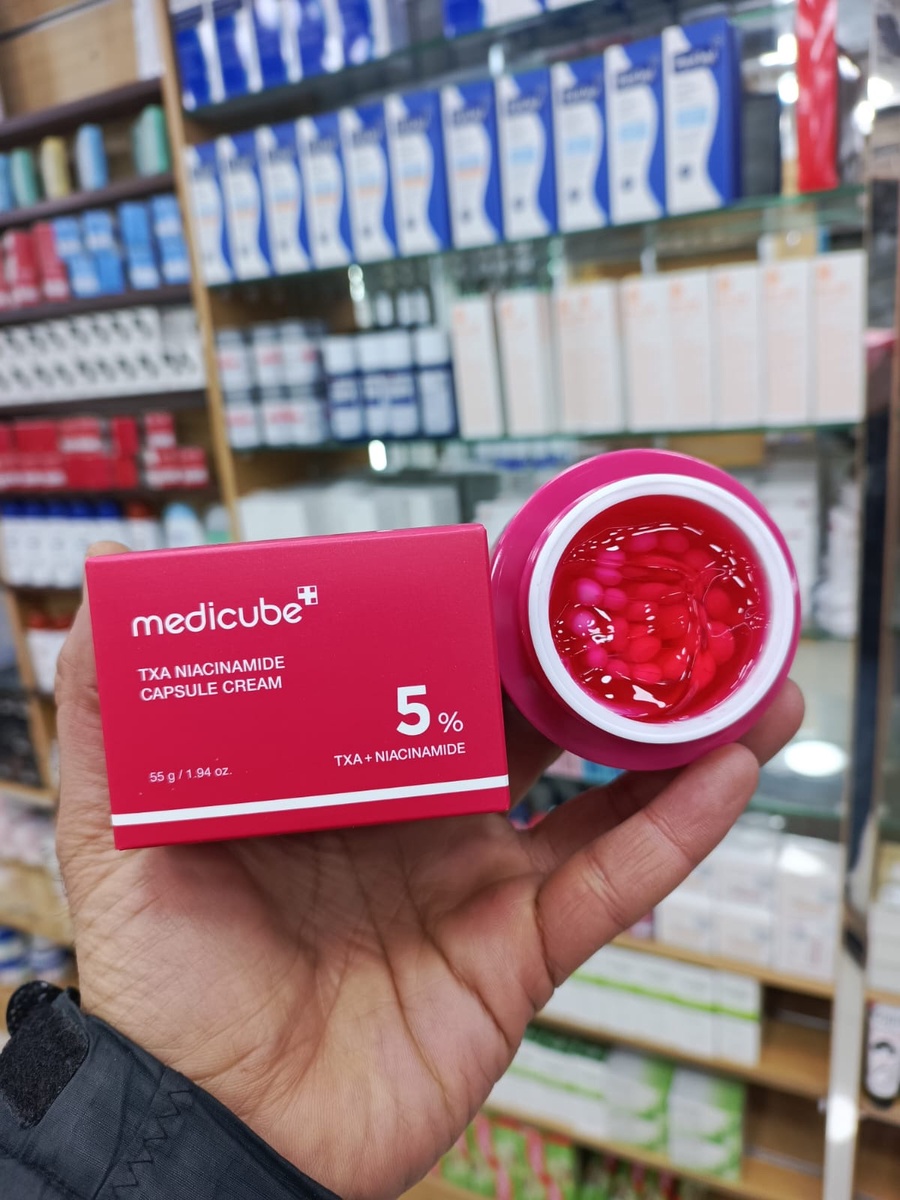 - كريم كبسولات حمض الترانيكساميك (TXA Niacinamide 5%): تركيبة قوية جداً لعلاج التصبغات، البقع الداكنة، وتوحيد لون البشرة بفعالية.