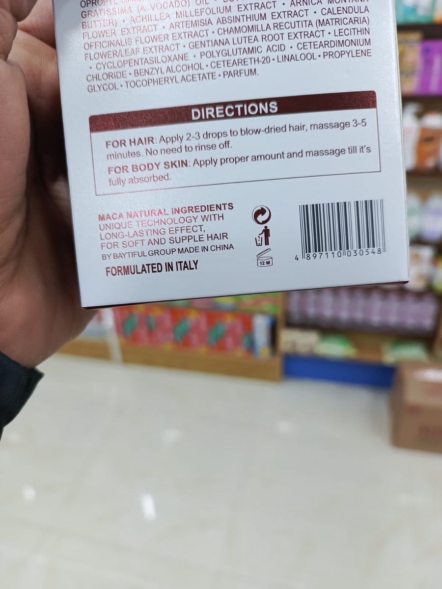 - خلاصة الماكا (Maca Essence): يحتوي على زيت الماكا الأساسي المضغوط على البارد (Cold-pressed)، وهي تقنية تضمن وصول الفائدة كاملة للشعرة لتعالجها من الداخل.