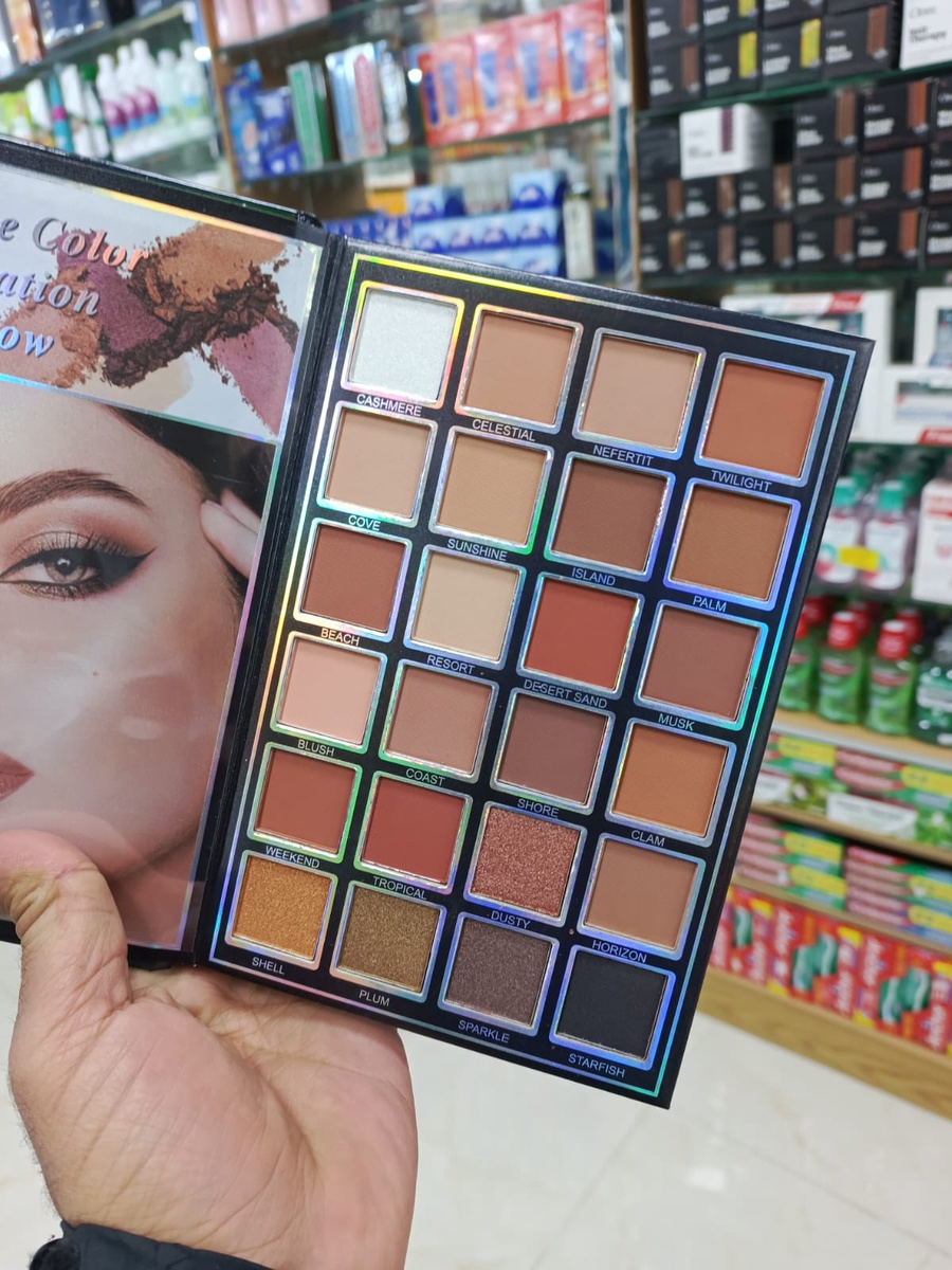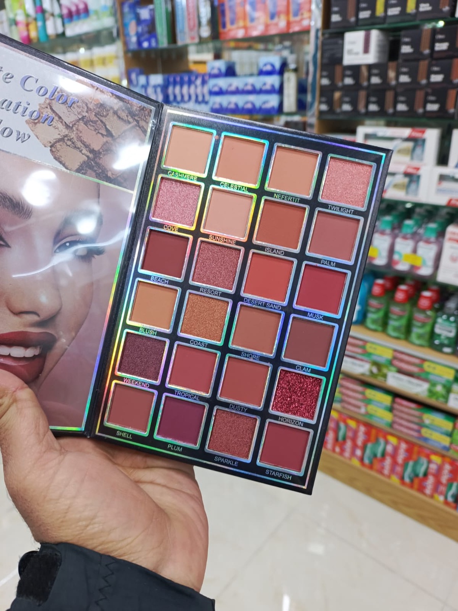 - تحتوي على 24 لون متنوع بين المات (Matte) واللمعة (Shimmer). الدرجات دافئة وترابية (بنيات، بيج، نحاسي) بالإضافة لألوان جريئة (أحمر، طوبي).
